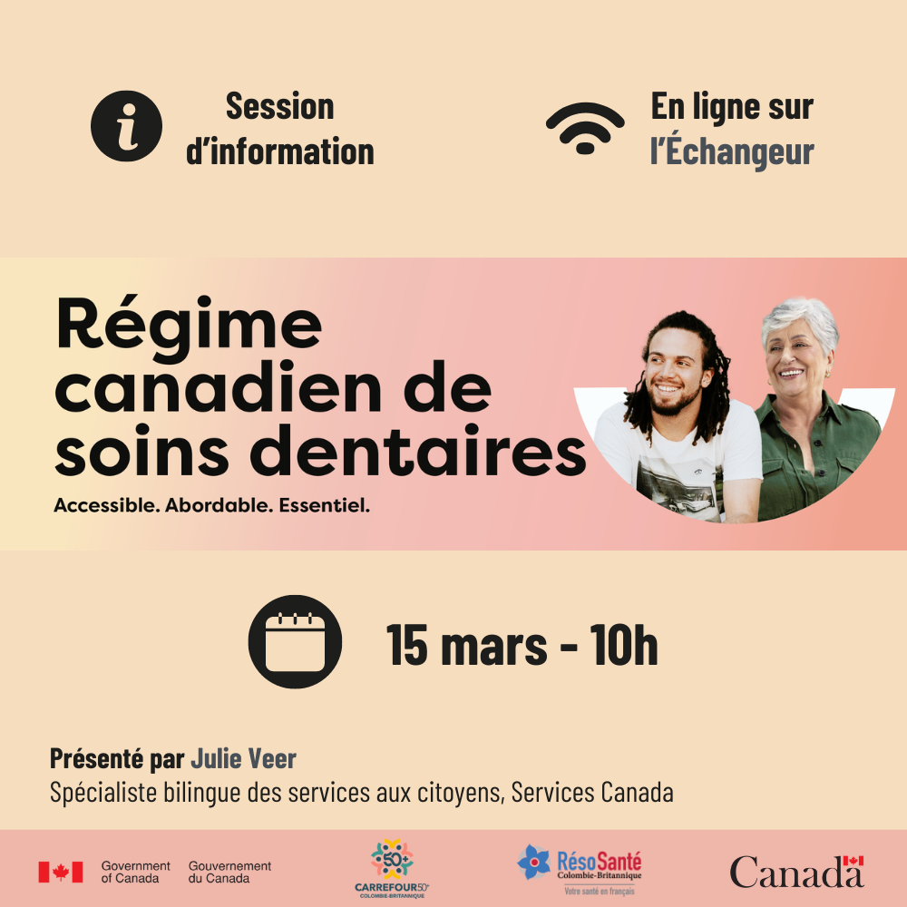 Ce webinaire est une session d'information sur le Régime canadien de soins dentaires, qui est présenté comme accessible, abordable et essentiel. Ce rendez-vous est une opportunité pour les citoyens de se renseigner davantage sur les avantages et les modalités de ce régime, dans le confort de leur propre espace. L'événement est organisé par le gouvernement du Canada en partenariat avec RésoSanté Colombie-Britannique.
