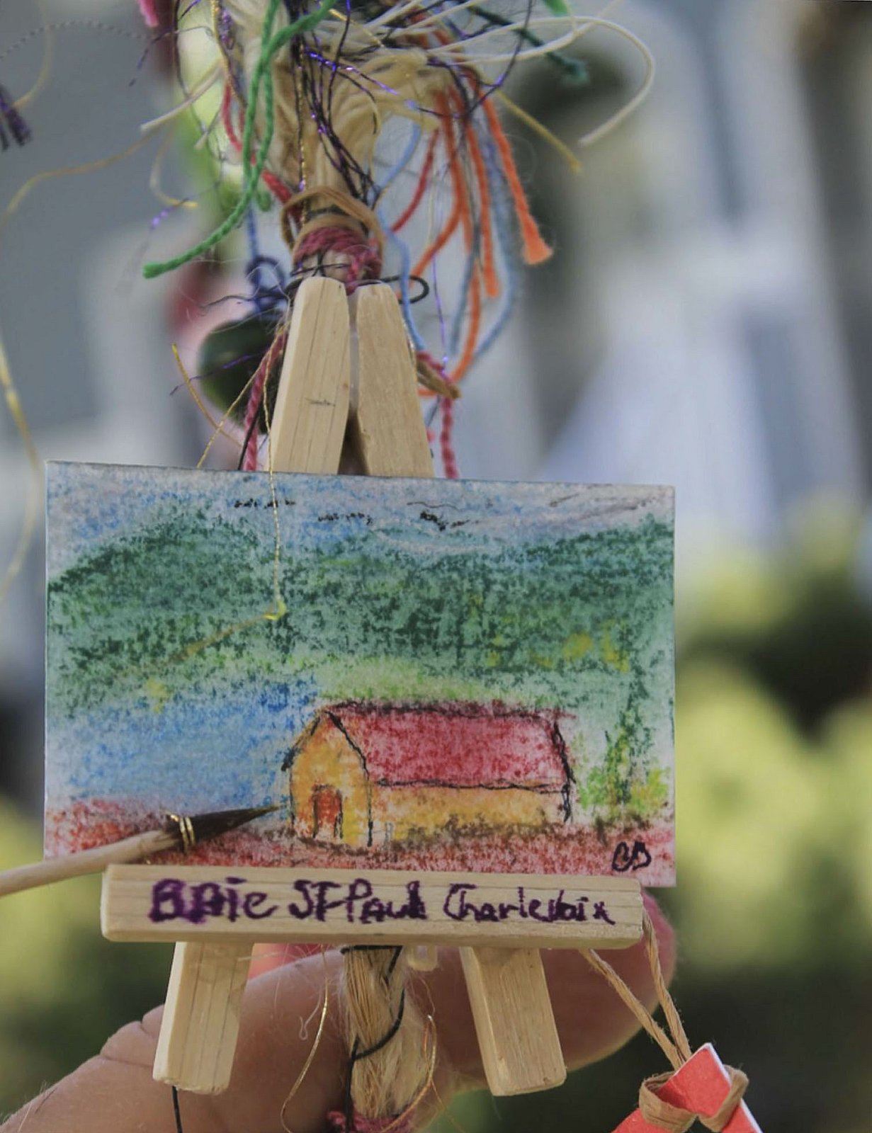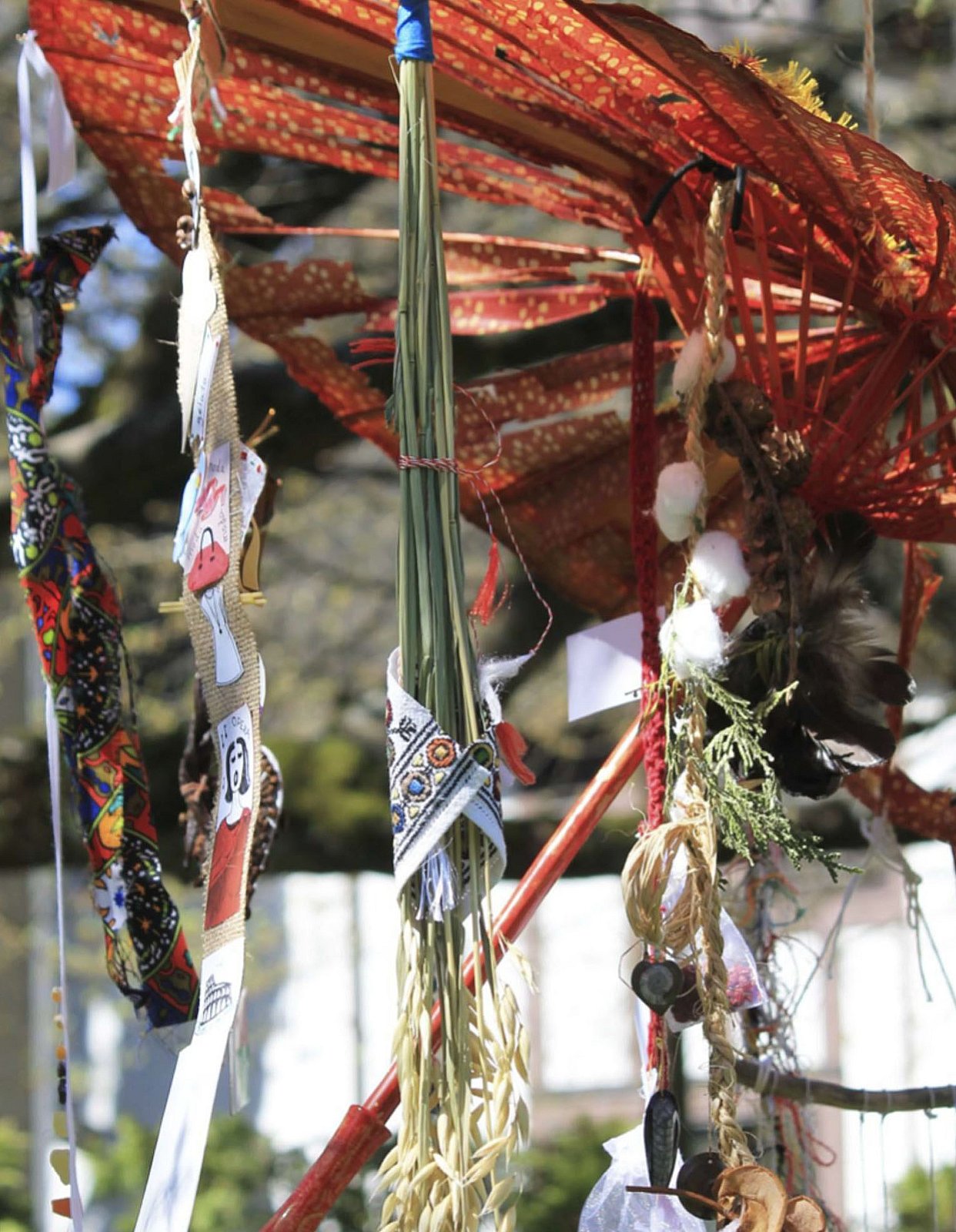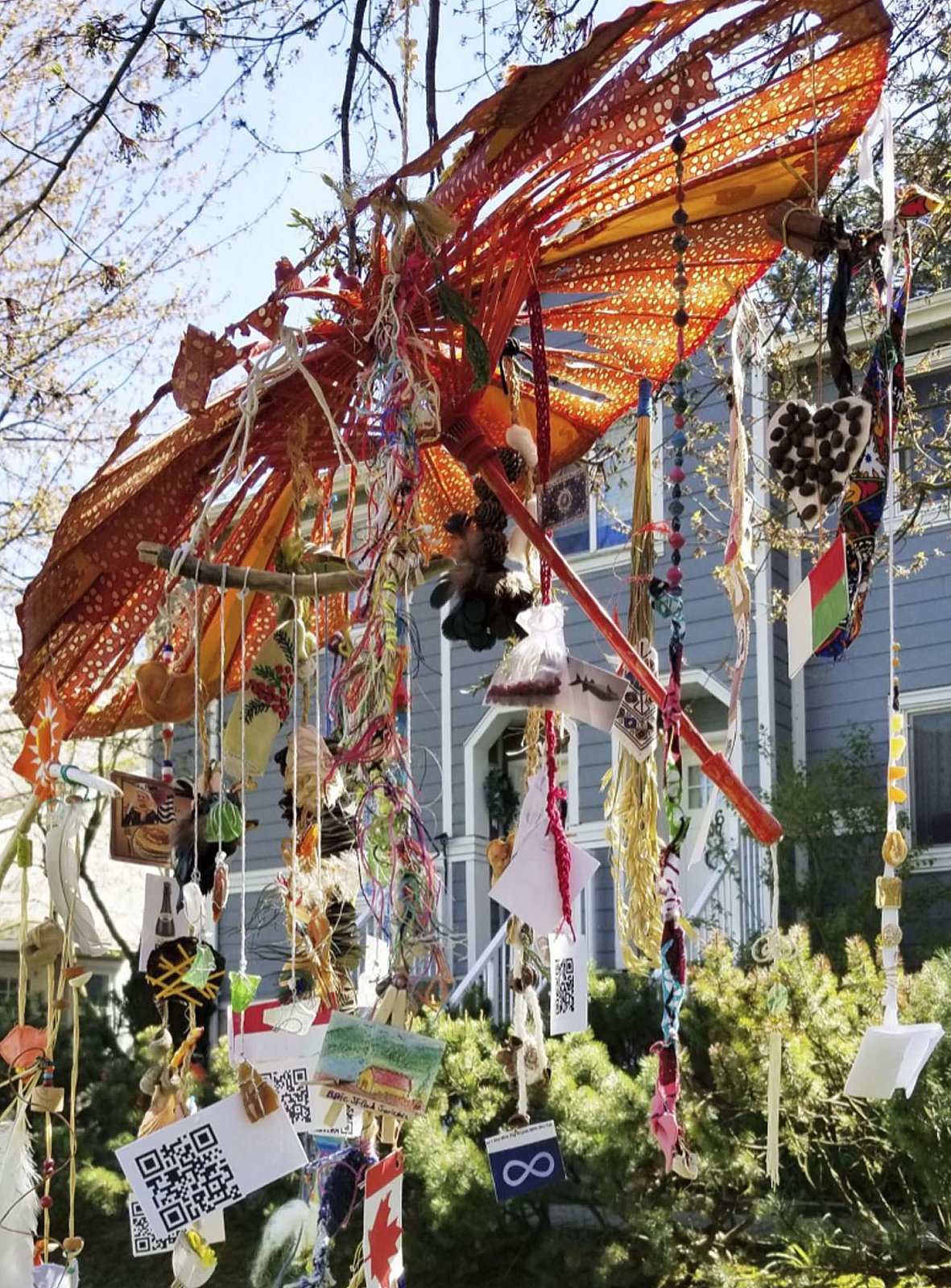 Chaque fil de l’installation en 3D représente une vie, une culture, une histoire, celles de chacun des participant.e.s. Les fils sont attachés à la circonférence d’un parapluie qui rassemble, abrite et représente le multiculturalisme propre à la francophonie de Vancouver.